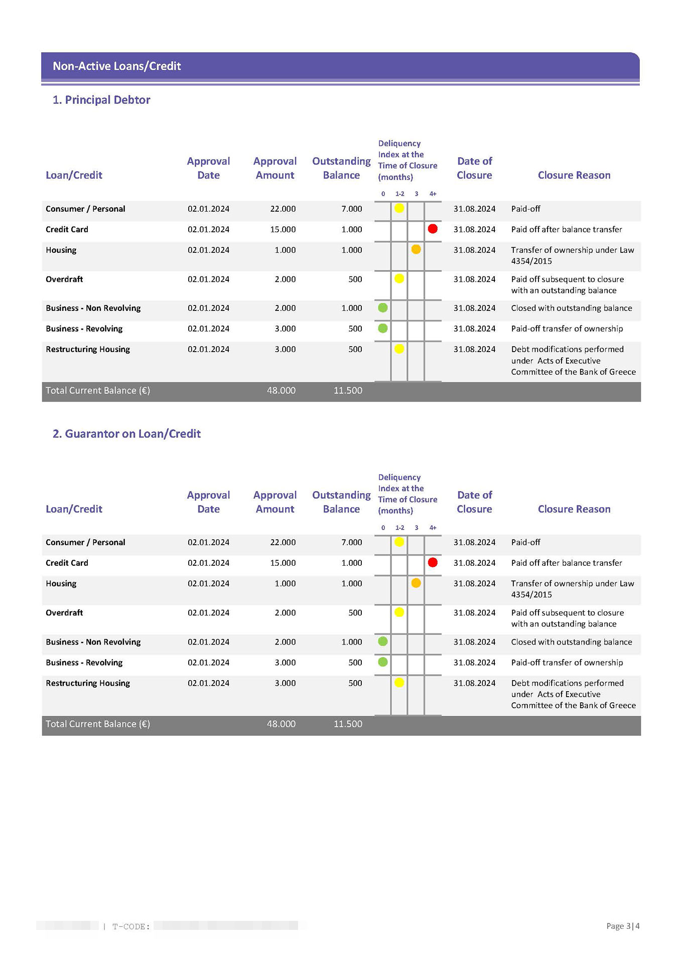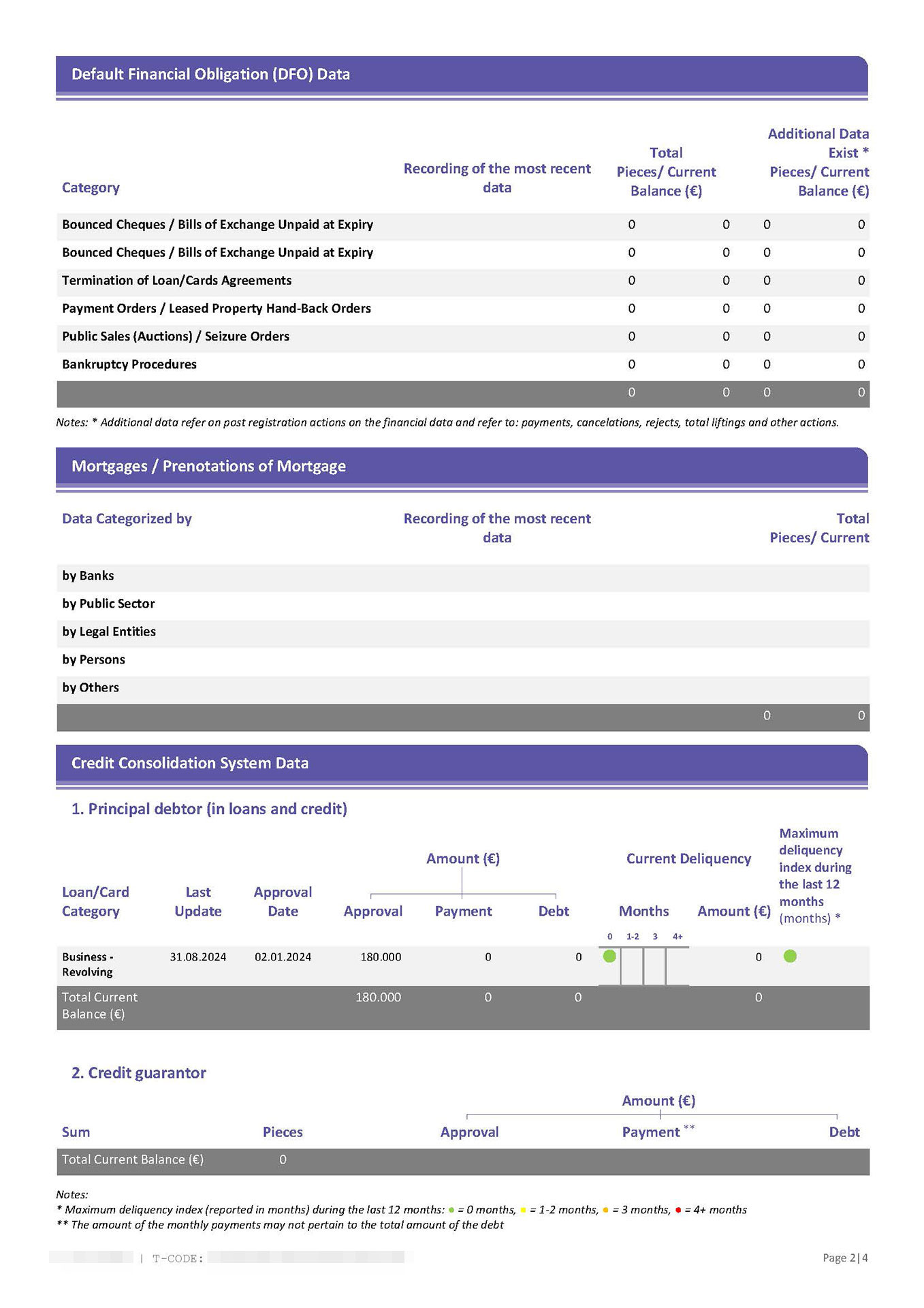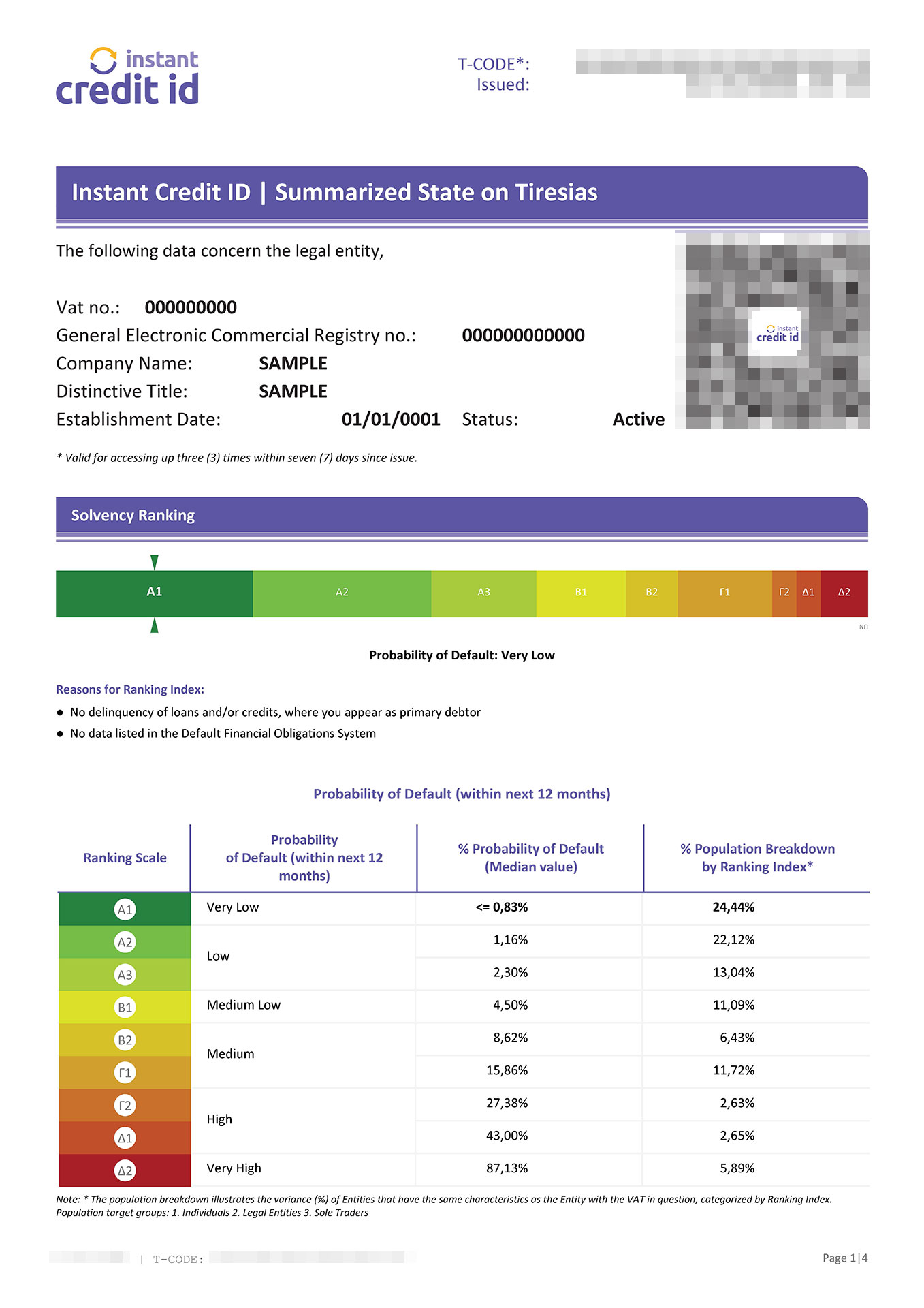 The Instant Credit ID report provides online access to all the financial data of your business, as registered in the Credit Consolidation System (C.C.S), the Default Financial Obligations (D.F.O.) and the Mortgage and Prenotations to Mortgages System (M.P.S) of Tiresias, as well as its solvency ranking, at the given time.
